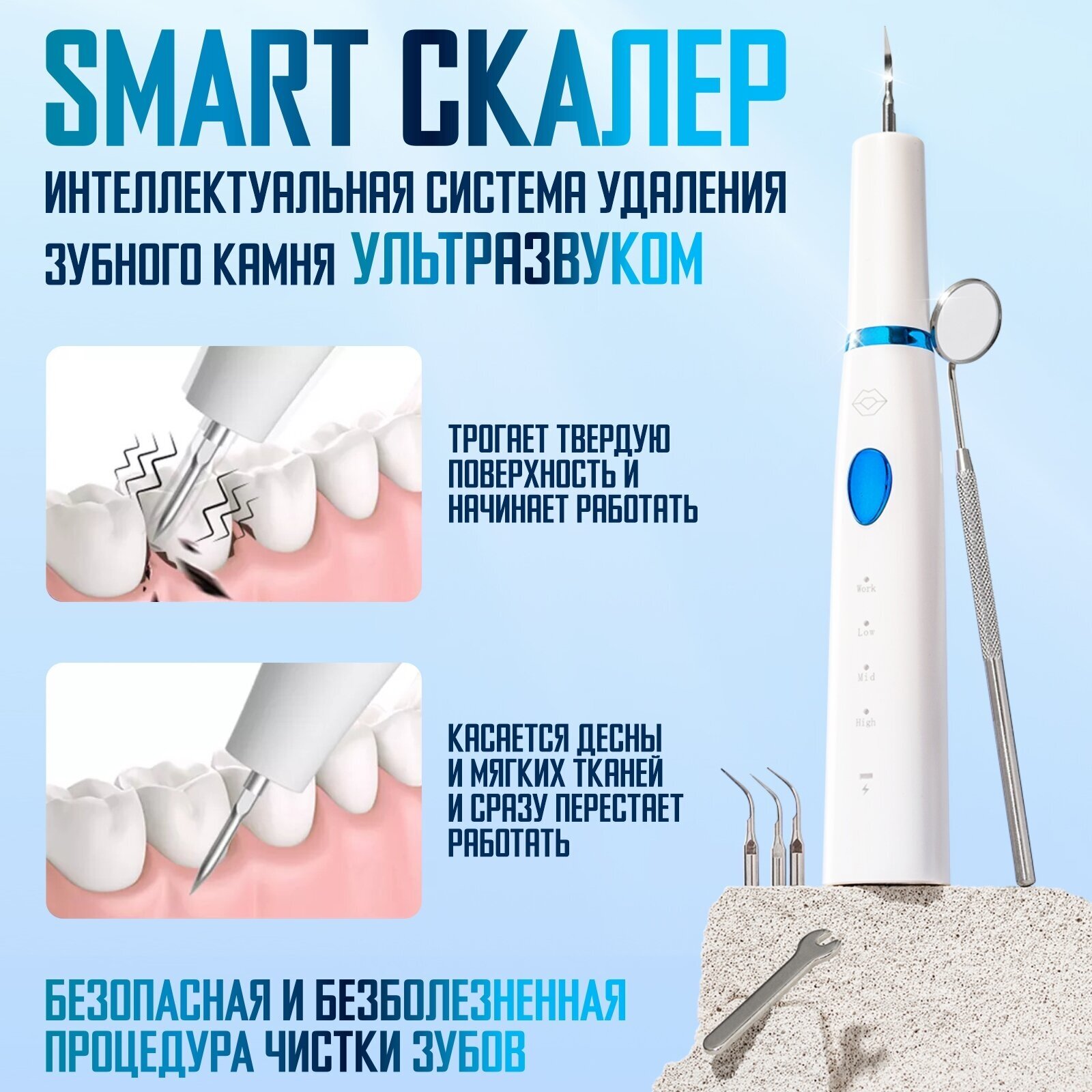 | Минусы: | Удаление даже небольшого зубного камня требует длительного времени и не происходит с первого раза (в режиме Low).
