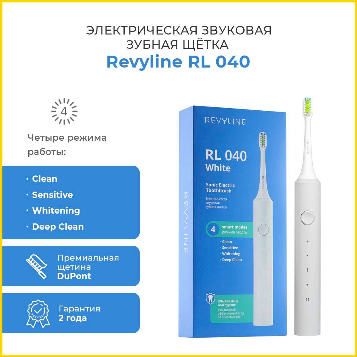 Revyline. Электрическая звуковая зубная щетка RL040, цвет белый