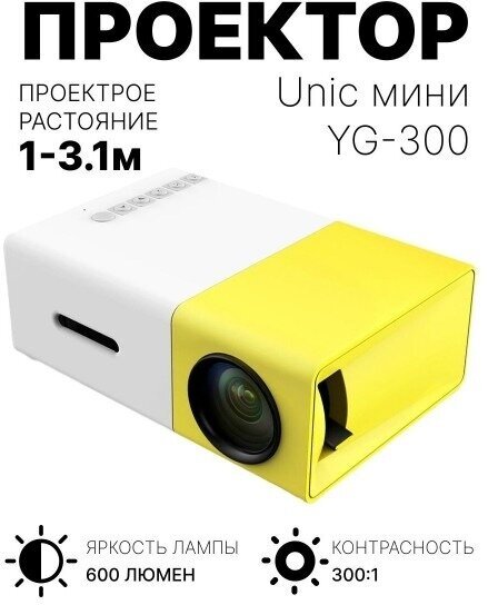 LED мини-проектор беспроводной Unic YG-300 с поддержкой HD видео портативный с пультом ДУ и аккумулятор в комплекте (корпус бело-желтый) 2 штуки интересное: