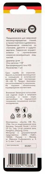 Сверло по металлу KRANZ 8 мм, с добавлением кобальта повышенной прочности, стандарт качества DIN 338