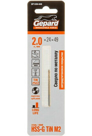 Сверло спиральное по металлу 2x24x49 мм, HSS TIN Gepard GP1320-049
