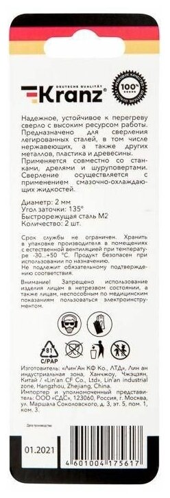 Сверло по металлу KRANZ 2 мм Стандарт+ из быстрорежущей стали P6M5 M-2, в упаковке 2 шт., стандарт DIN 338