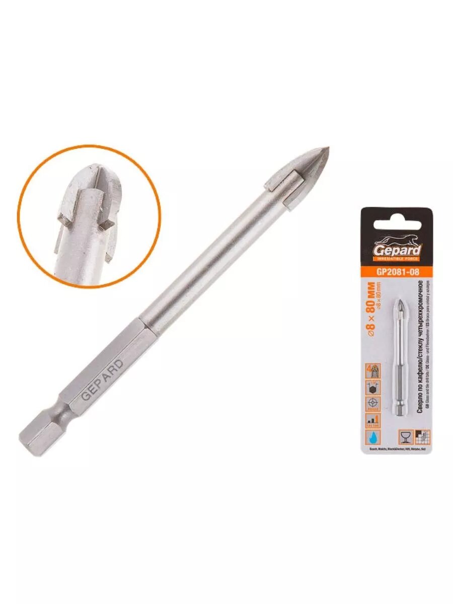 Сверло по кафелю/стеклу 8х80мм четырехкромочное шестигр. GEPARD (GP2081-08) (Impact, по керамической плитке, крестовая пластина)
