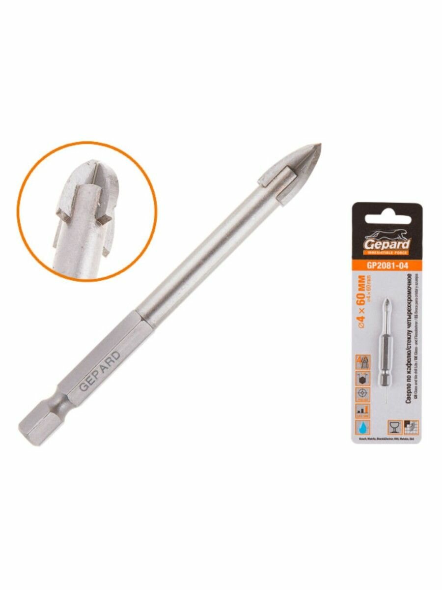 Сверло по кафелю/стеклу 4х60мм четырехкромочное шестигр. GEPARD (GP2081-04) (Impact, по керамической плитке, крестовая пластина)