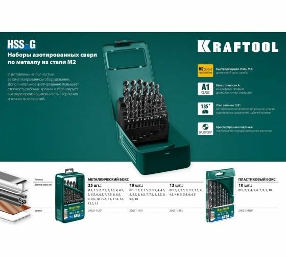 KRAFTOOL HSS-G 25шт(1-13мм), Набор сверл по металлу HSS-G, сталь М2(S6-5-2)