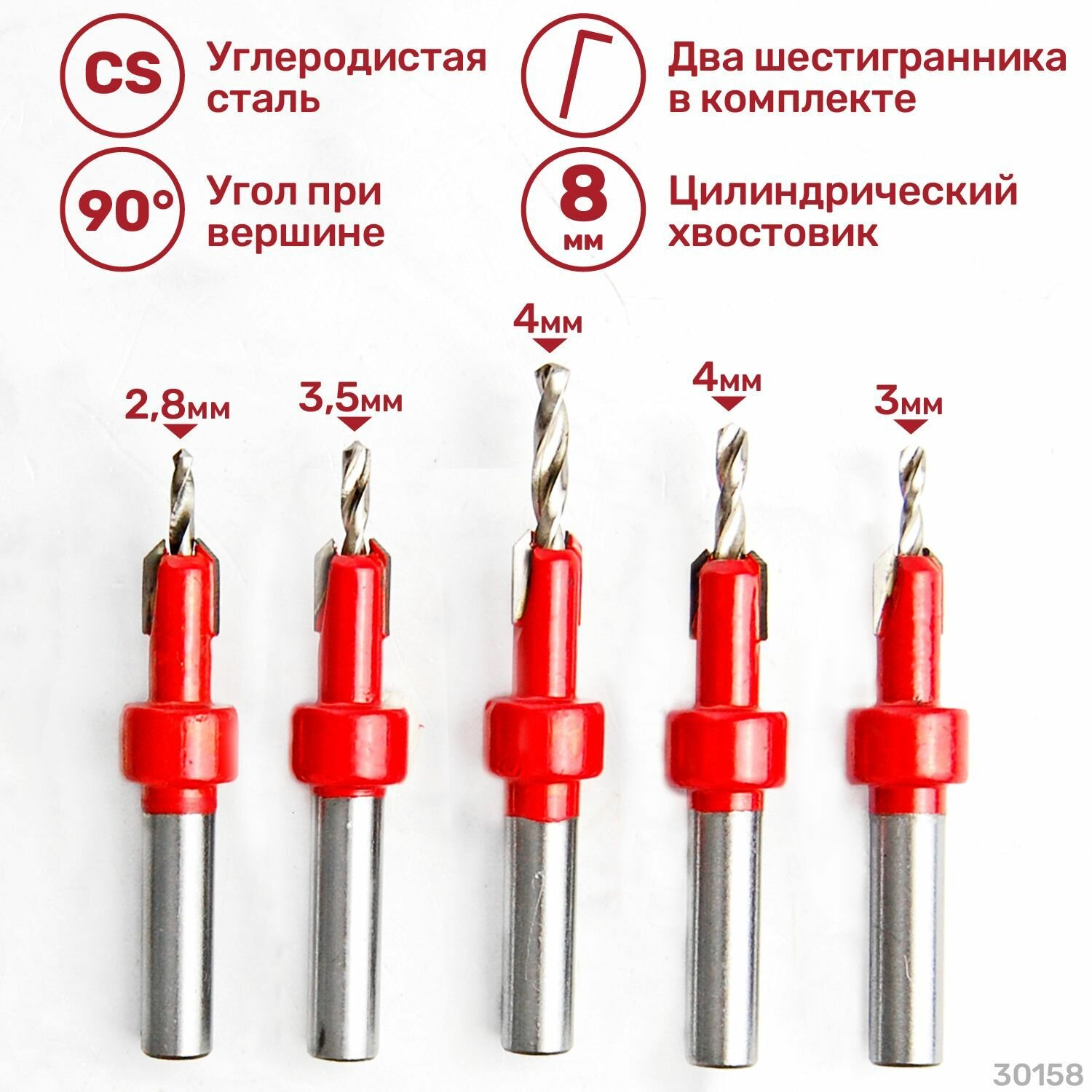 Набор сверл зенковочных по дереву 2,8/3,0/3,2/3,5/4,0/8мм 5 пр 30158 Скраб