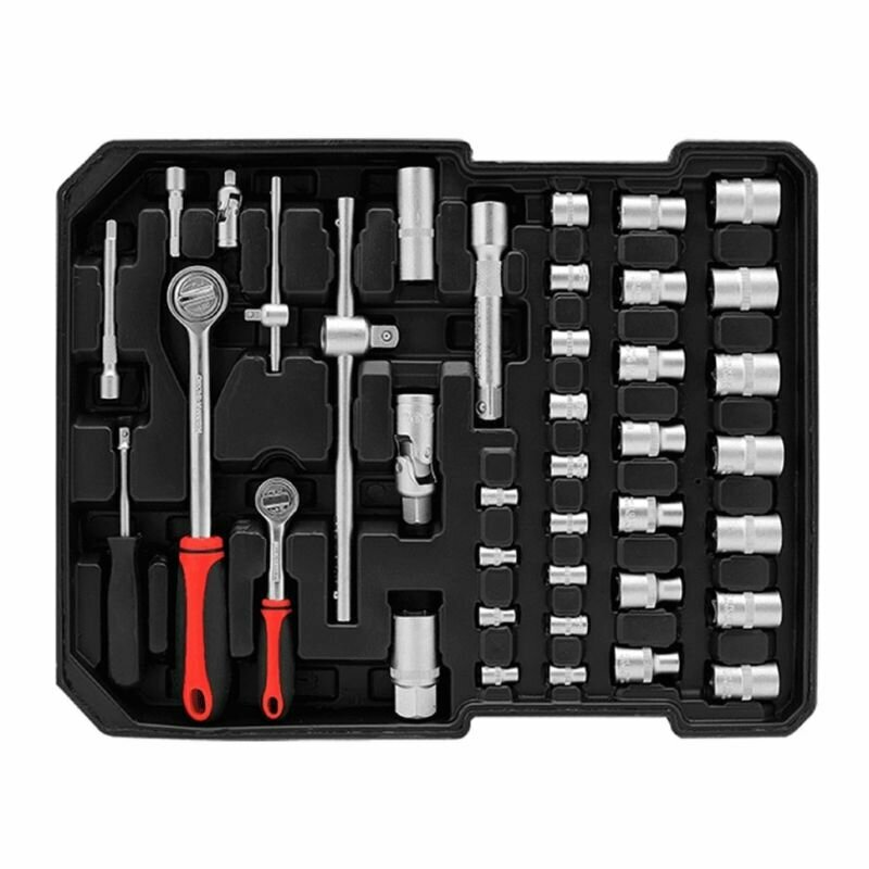 | Головки торцевые подробно | 14 шт. - торцевые головки 1/2": 8, 9, 10, 11, 12, 13, 14, 15, 16, 17, 18, 19, 20, 21 мм; 13 шт. - торцевые головки 1/4": 4, 4.5, 5, 5.5, 6, 7, 8, 9, 10, 11, 12, 13, 14 мм; 2 шт. - торцевые головки свечные 1/2": 16, 21 мм. |