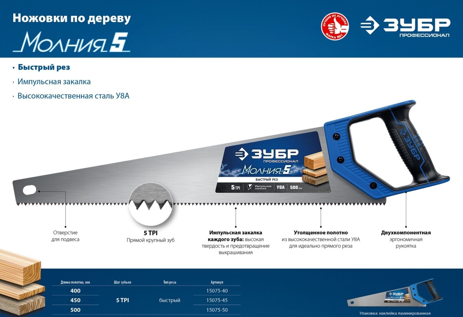 Ниже Вы можете прочитать отзывы на Ножовка по дереву ЗУБР Молния-5 450 мм (15075-45_z02), ознакомится с подробными характеристиками, посмотреть интересные обзоры и фотографии на Ножовка по дереву ЗУБР Молния-5 450 мм (15075-45_z02).