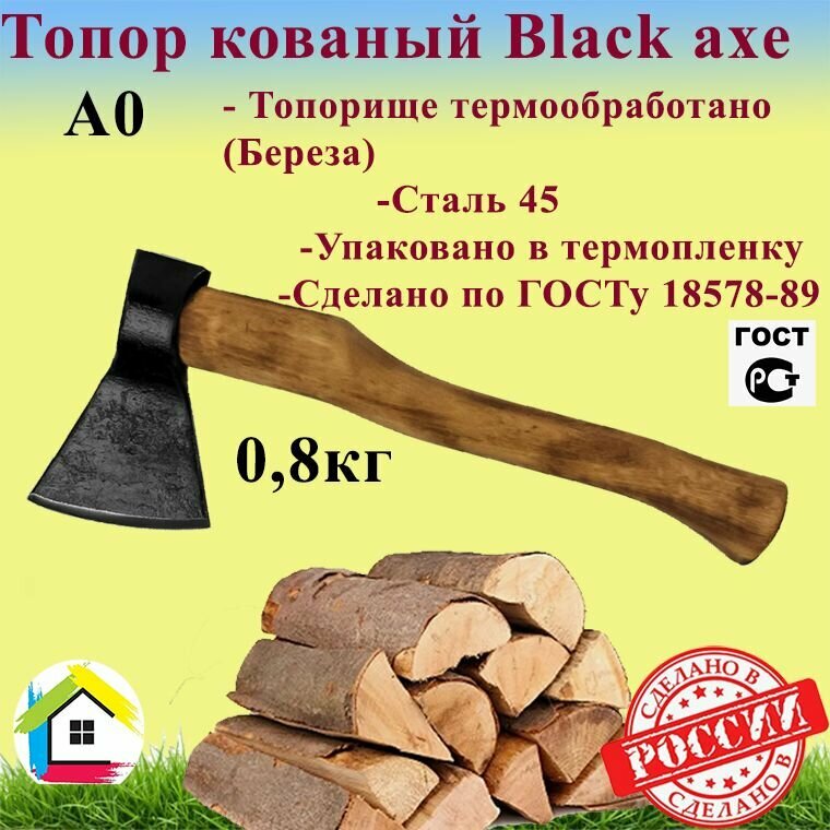 Топор кованый с деревянной рукояткой "Black Axe" ТопАр 0,8 кг/Топорище 400 мм термообработанное из березы/дерево/с порошковым покрытием/в сборе А0 интересное: