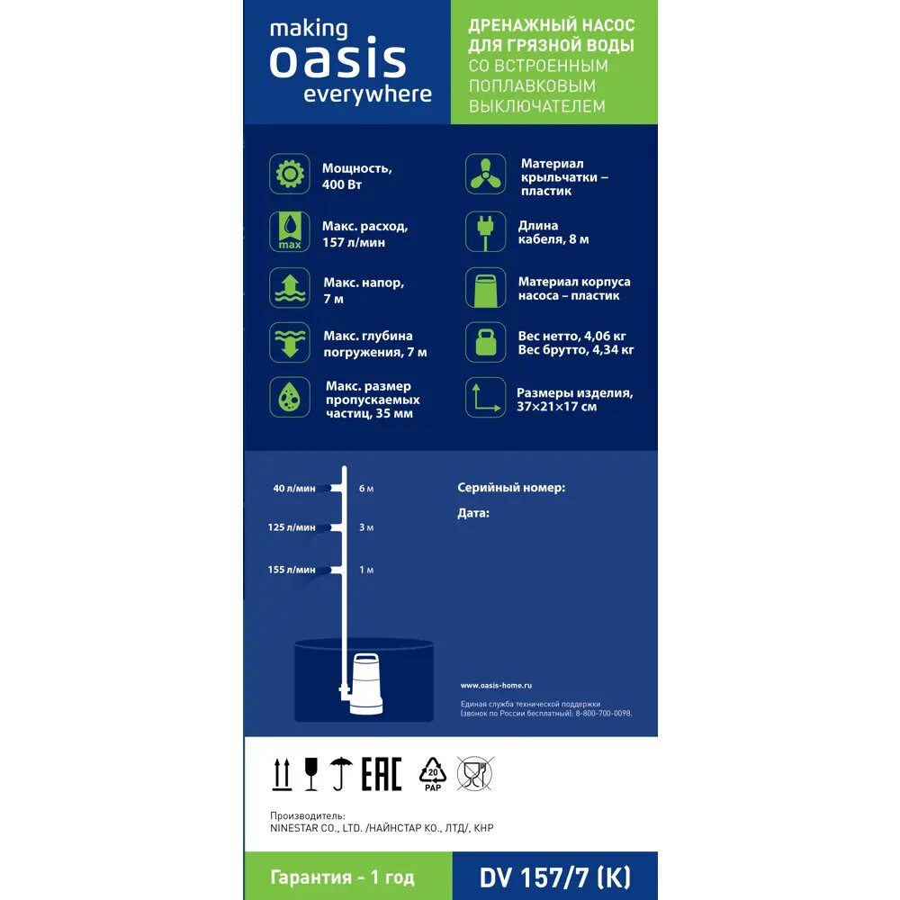 Насос погружной для грязной воды Oasis DV157/7, 9420 л/час / Насос дренажный интересное: