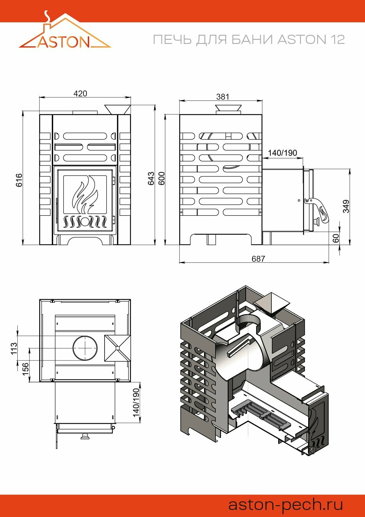 Печь для бани ASTON 16 дровяная с закрытой каменкой и стеклом