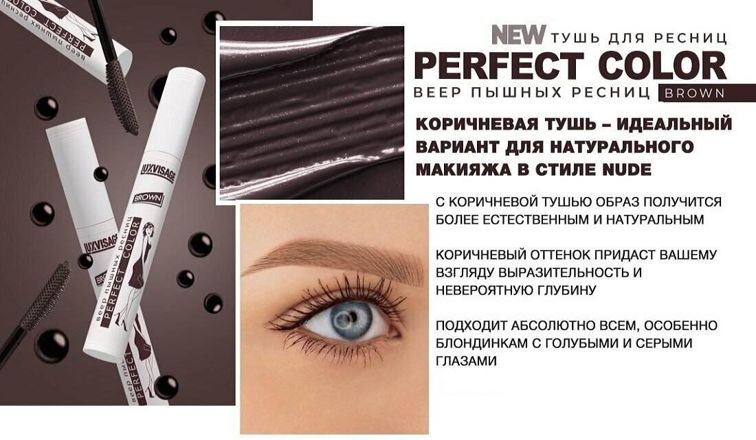 LUXVISAGE Тушь для ресниц PERFECT COLOR веер пышных ресниц коричневая, 9 мл