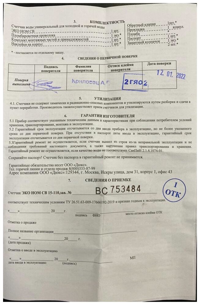 | Отзыв: | Покупались на замену старых, в комплекте есть прокладки. На счетчиках нет года выпуска, без паспорта не определить, когда подошел срок поверки. В паспорте есть отметка о дате поверки. Межповерочный интервал 6 лет для горячей или холодной воды. |