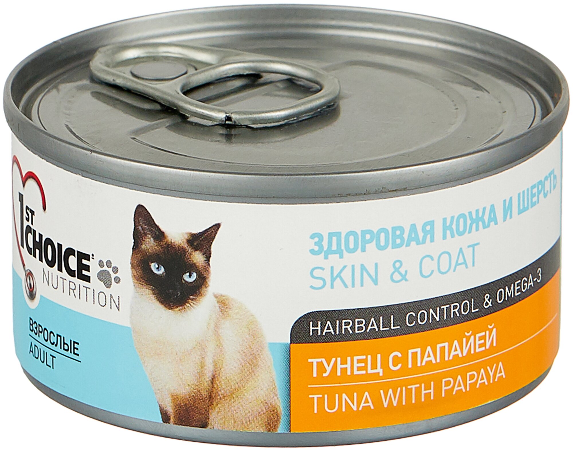 Влажный корм для кошек 1st Choice Healthy skin and coat для вывода шерсти, с тунцом, с папайей 85 г (кусочки в соусе)