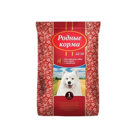 Родные корма 22/10 1 пуд 16,38 кг сухой корм для взрослых собак с говядиной