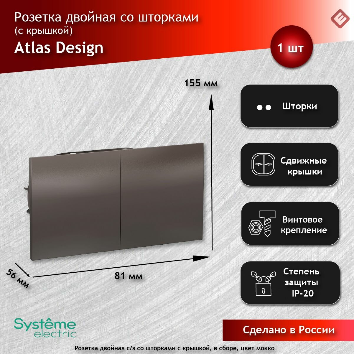 1 шт. Systeme Electric AtlasDesign Мокко, Розетка c заземлением двойная, со шторками, с крышкой, 16А, в сборе, ATN000628