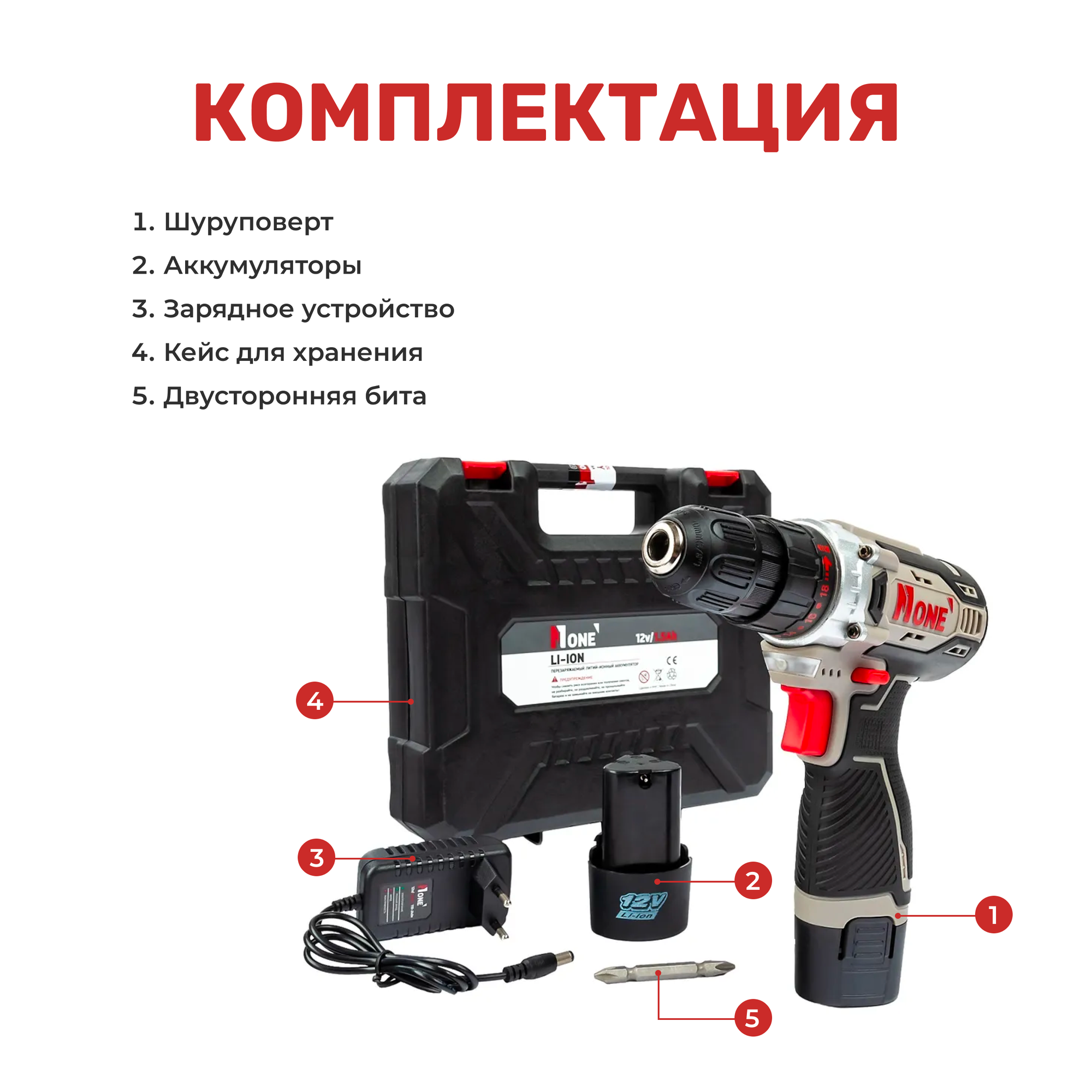 Дрель шуруповерт NUMBER ONE CD12/1.5-PROMO, от аккумулятора, 12 В, 22 Нм, 2 АКБ интересное: