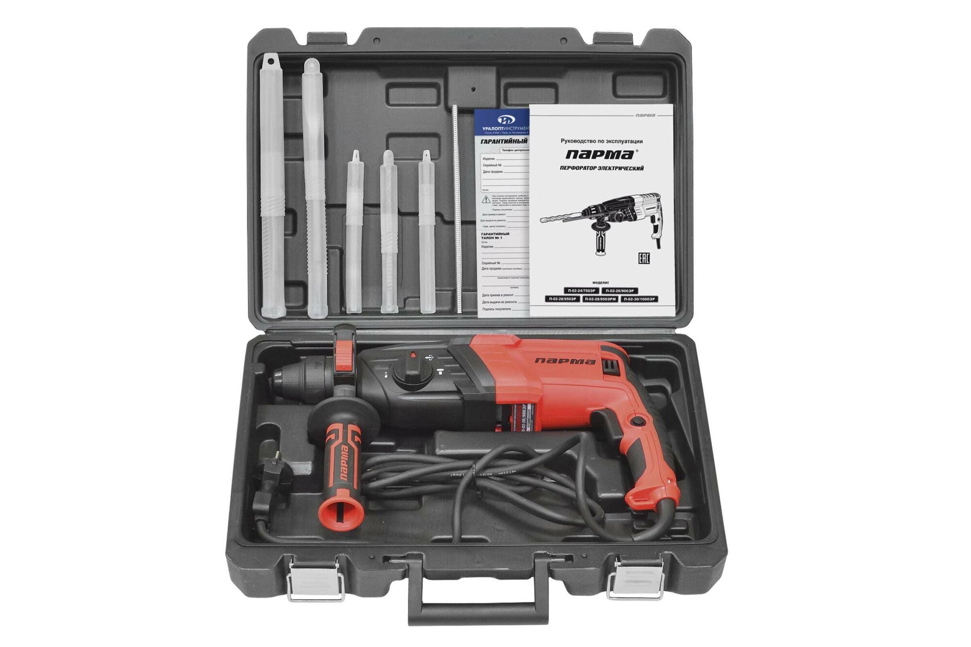 Перфоратор парма SDS-plus П-02-26/900ЭР (900Вт,3реж,3.0Дж,бетон 26мм) 3.45кг кейс+5 насадок