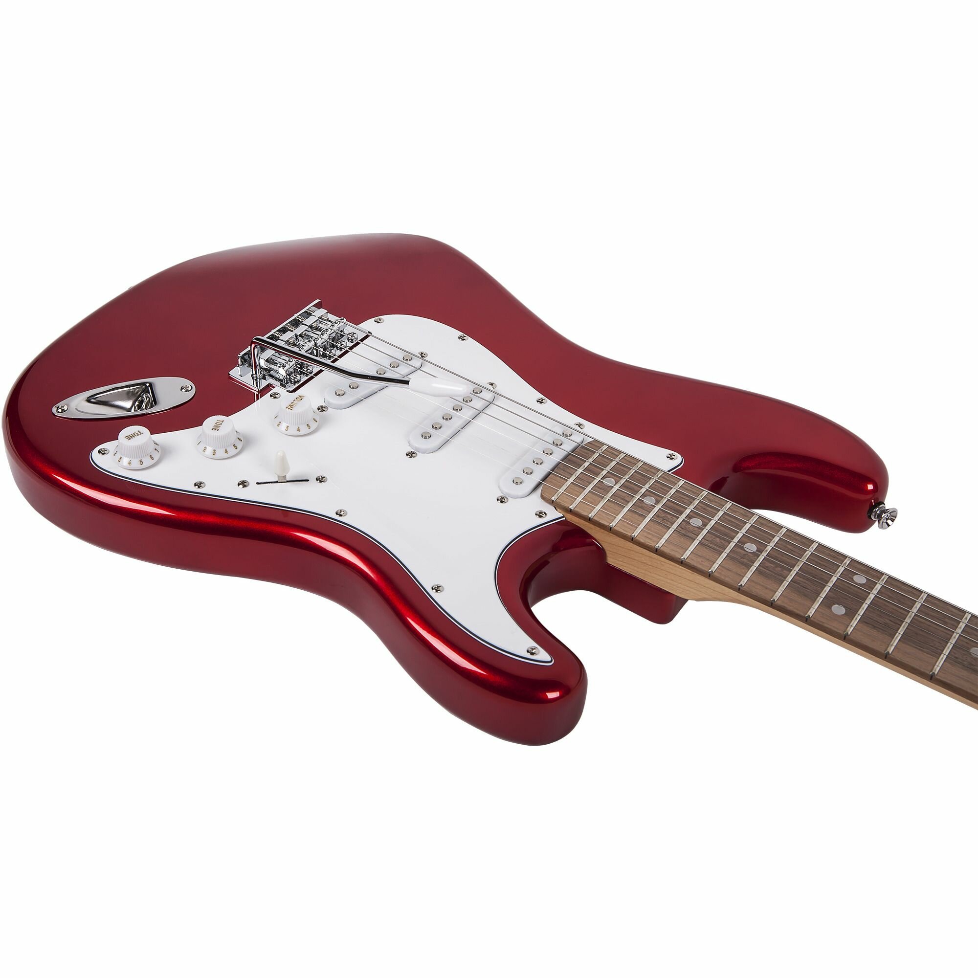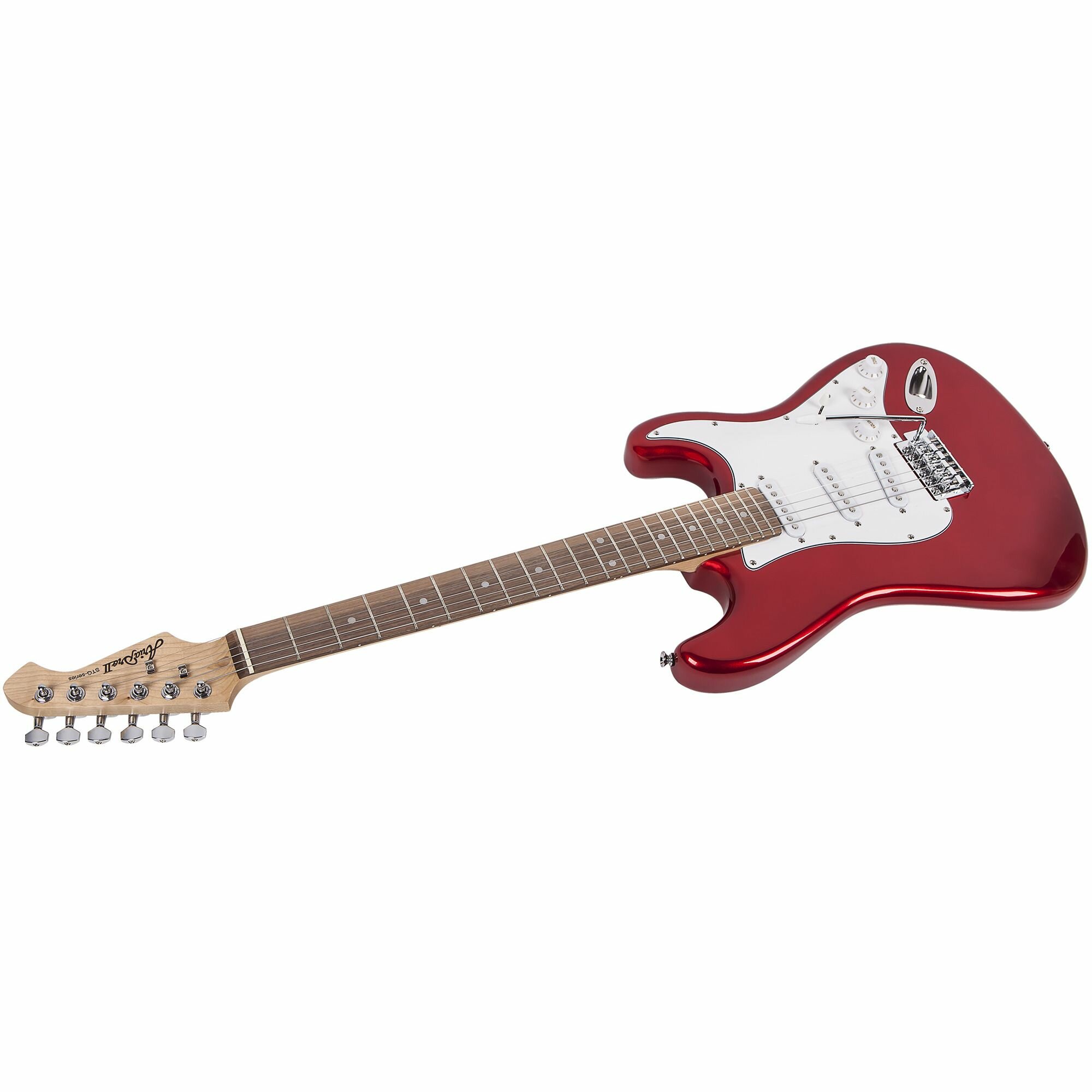 ARIA STG-003 CA-Гитара электрическая, ольха, гриф: клен, накладка: палисандр, лады: 22F, масштаб: 648mm (25-1/2 "),регуляторы: громкость х 1, тон 2 х, Switch PU Selector х 1, тремоло, фурнитура Chrome.Цвет - карамель яблоко красный.