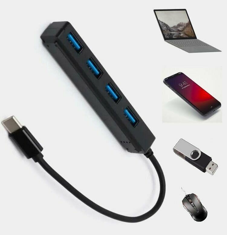 Купить USB Type-C разветвитель, 4 порта, OTG / концентратор / Hub / USB Хаб, черный