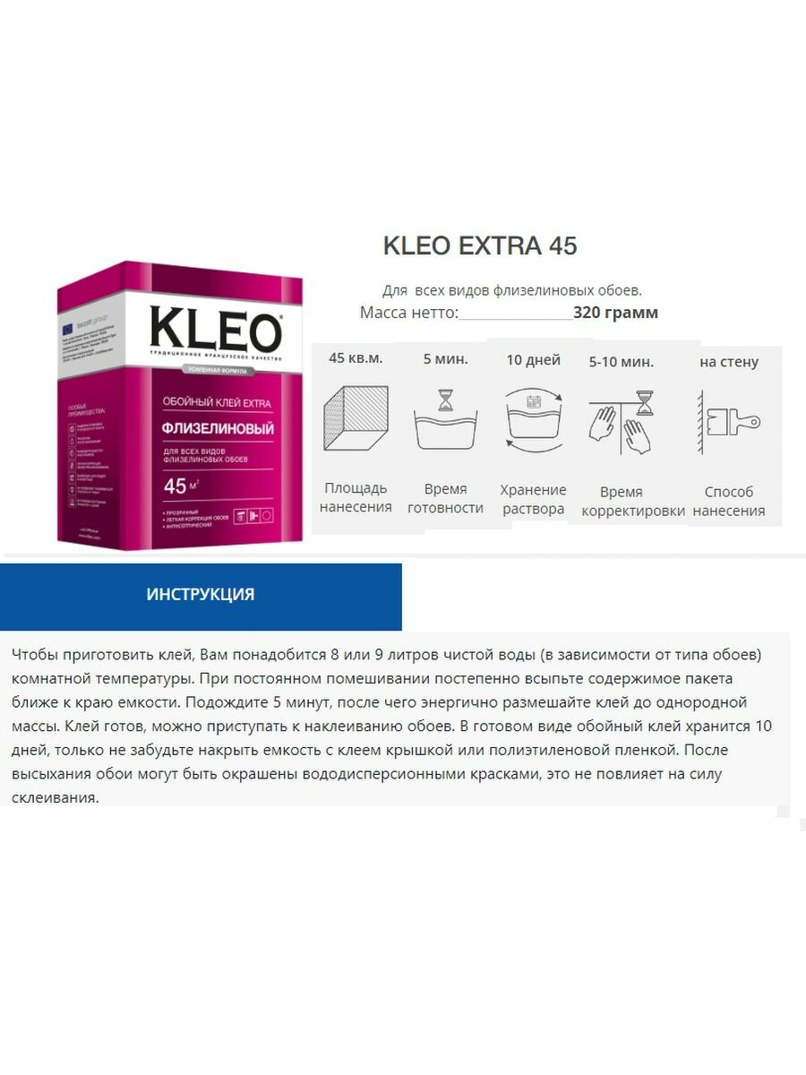 Клей обойный для флизелиновых обоев KLEO EXTRA, 320 гр, 45 кв.м.
