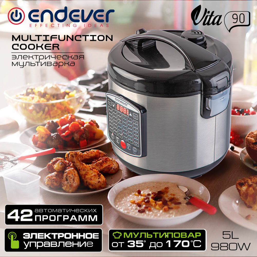 Мультиварка Endever Vita 90 мощностью 980 Вт, с антипригарной чашей на 5л, 42 авторежима работы, мастер повар, таймер до 24 часов, автоподогрев, стальной корпус, регулировка времени/темпа приготовления
