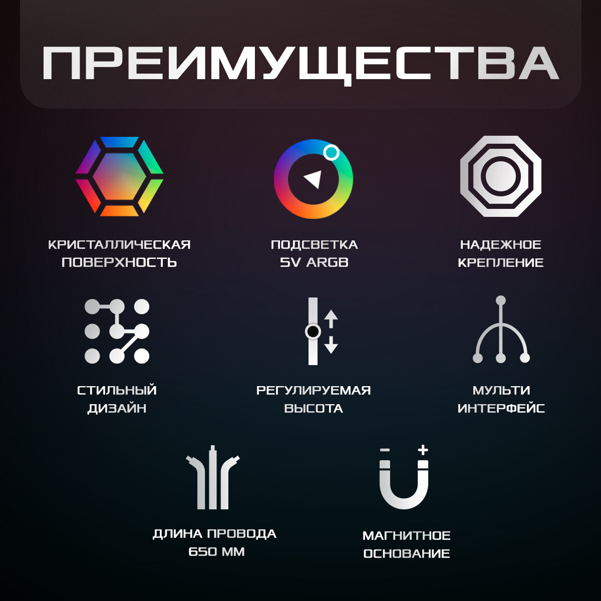Магнитное дно. Кабель ARGB с удлинителем. Мягкие накладки чтобы не царапало поверхности. |
