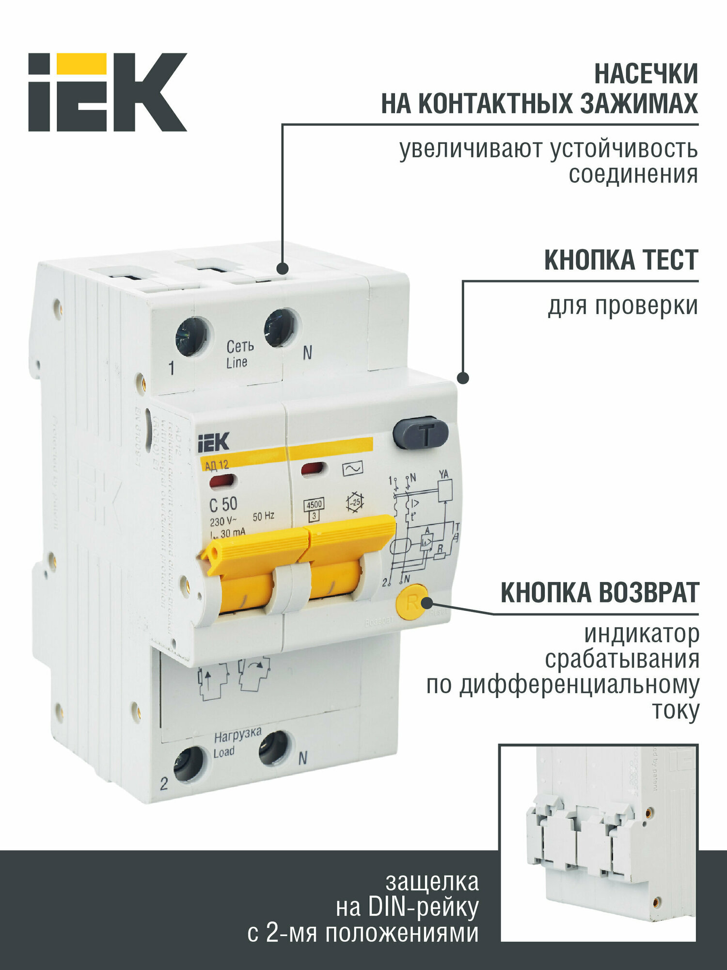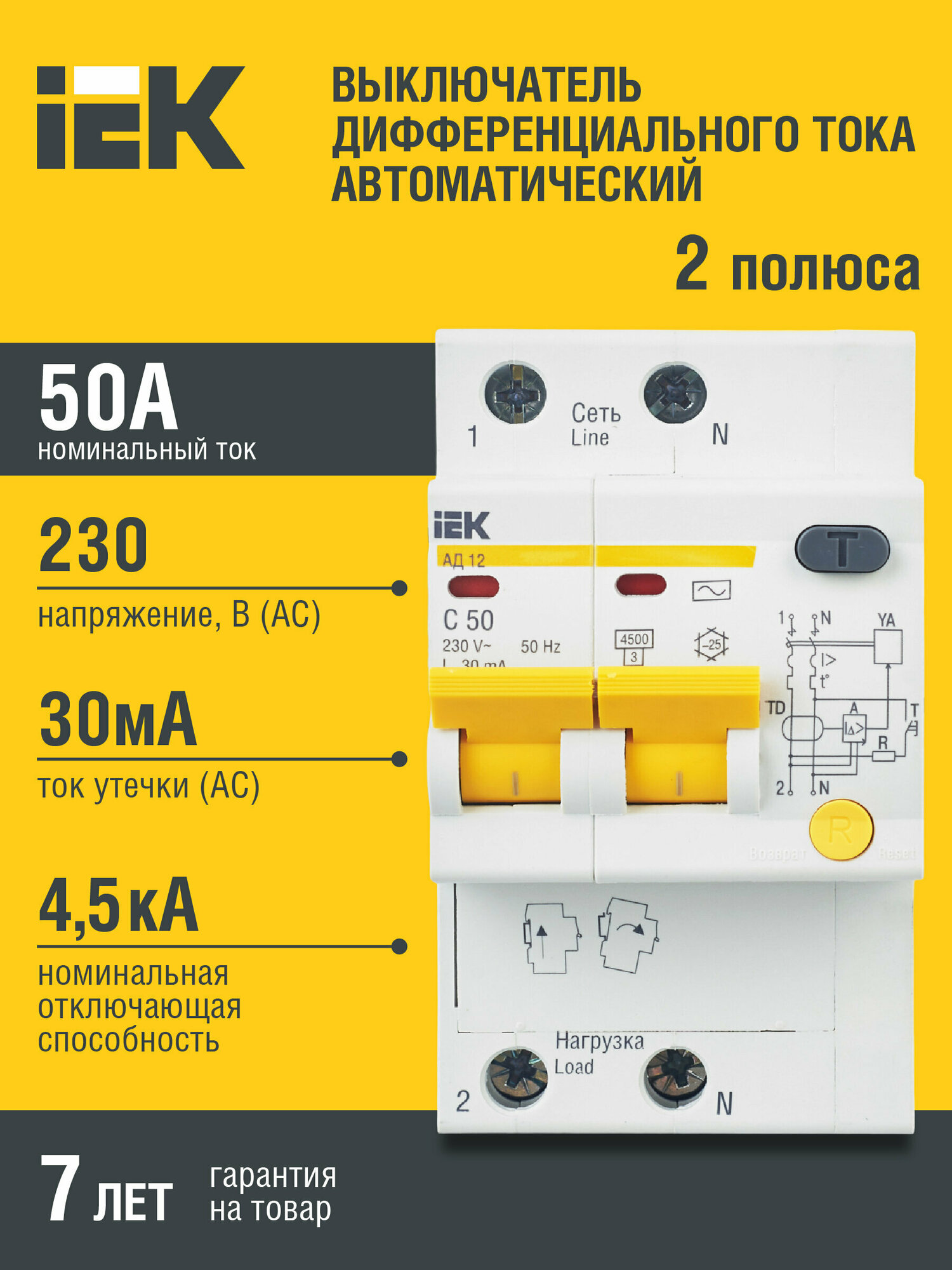 Дифференциальный автоматический выключатель АД12 2Р 50А 30мА IEK