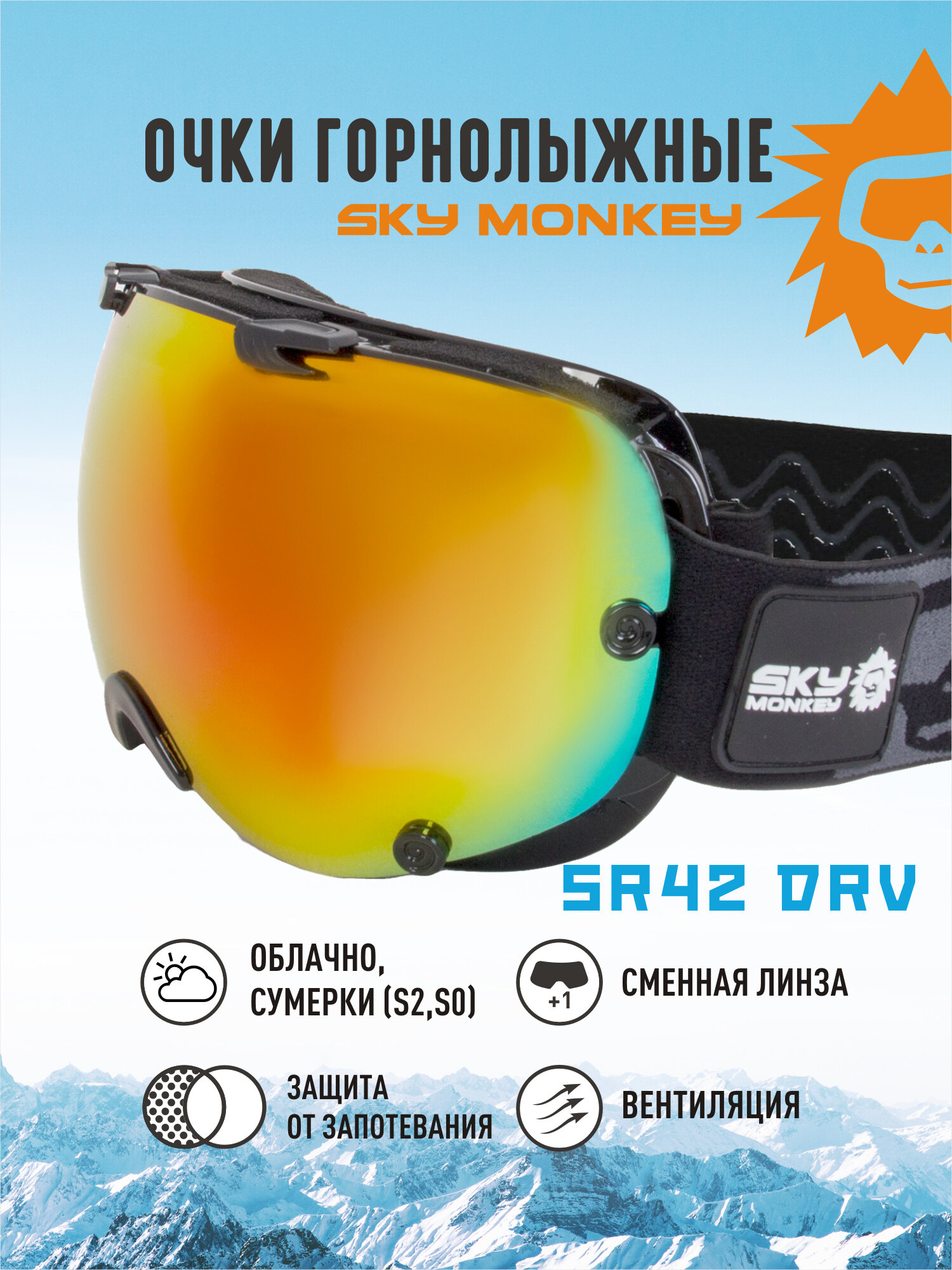 Очки горнолыжные Sky Monkey SR42 DRV со сменной линзой интересное: