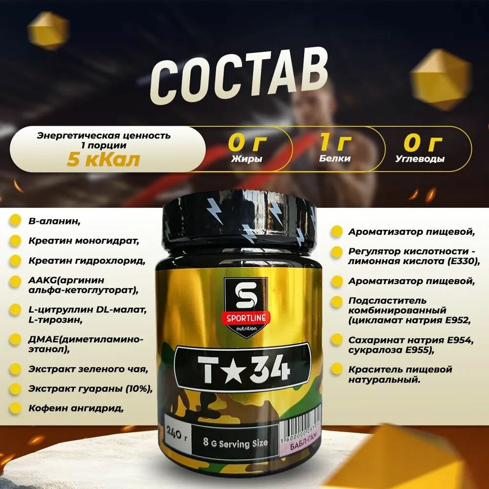 SportLine Nutrition Предтренировочный комплекс T-34 (240 гр.) Вкус: Bubble Gum