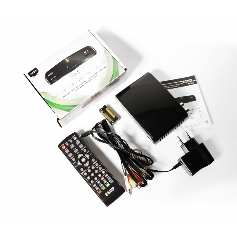 | Комплектация | Ресивер HD-515; Пульт ДУ с батарейками; Паспорт (с инструкцией по эксплуатации и гарантийным талоном); Соединительный кабель RCA; Адаптер питания |