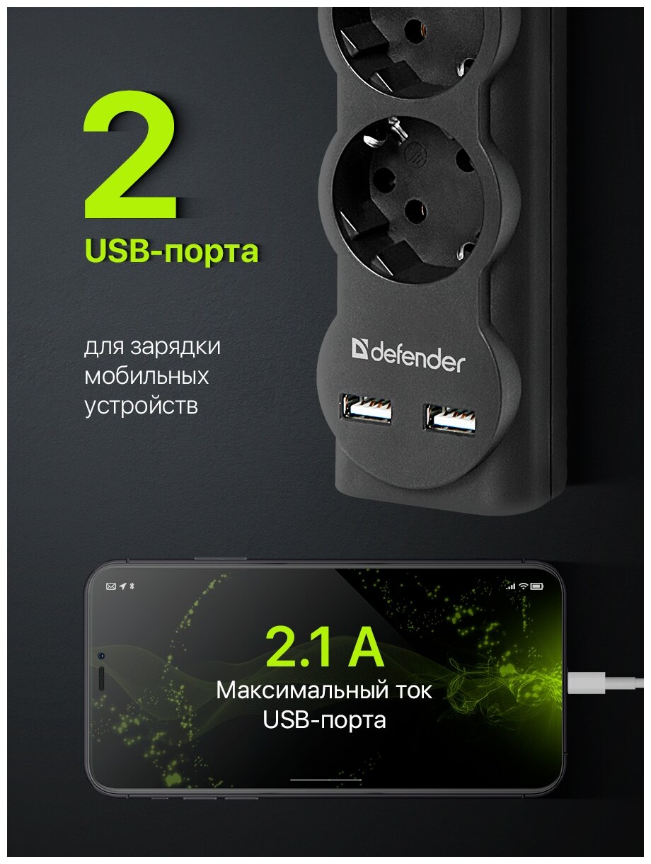 Фильтр сетевой 3м 10А 2200Вт 5 гнезд + 2 USB с заземлением черный DEFENDER