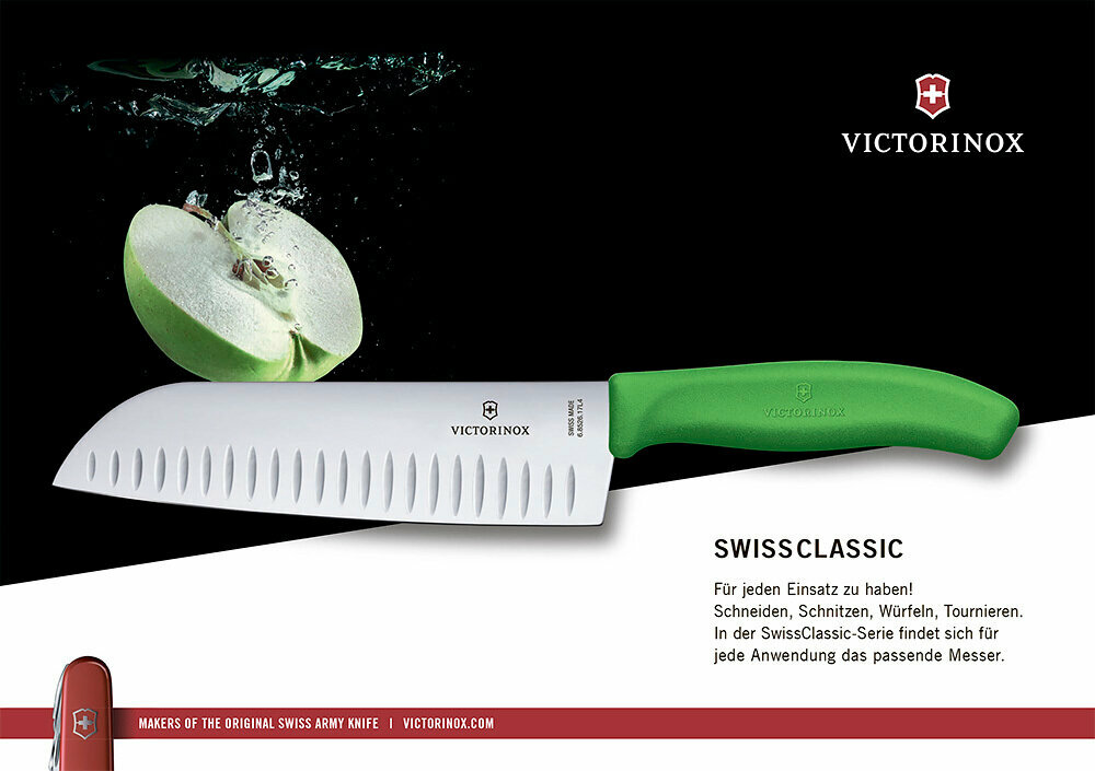 Нож сантоку VICTORINOX Swiss Classic, рифлёное лезвие из нержавеющей стали 17 см, рукоять зеленого цвета (6.8526.17L4B)