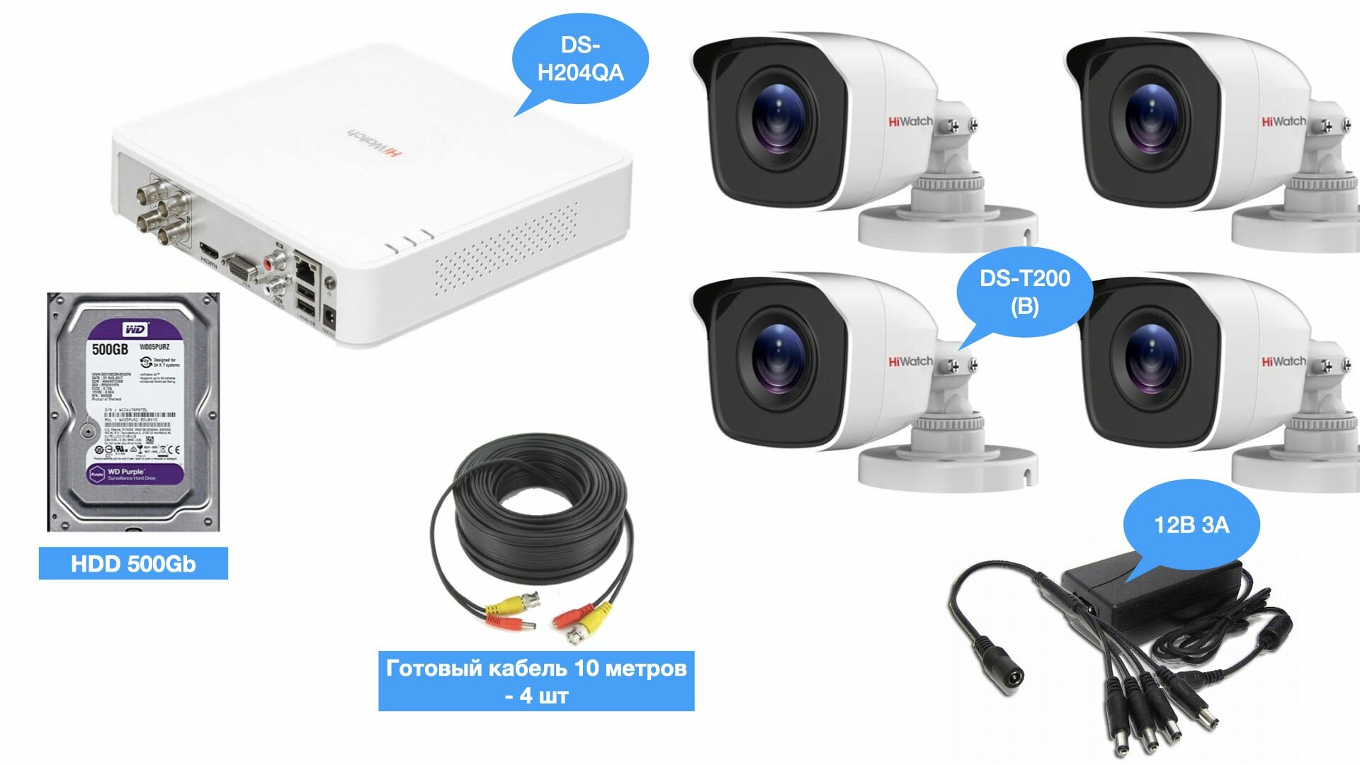 Купить Полный готовый комплект видеонаблюдения Hiwatch на 4 камеры Full HD (HiKIT4DST200_HDD500GB_10M)
