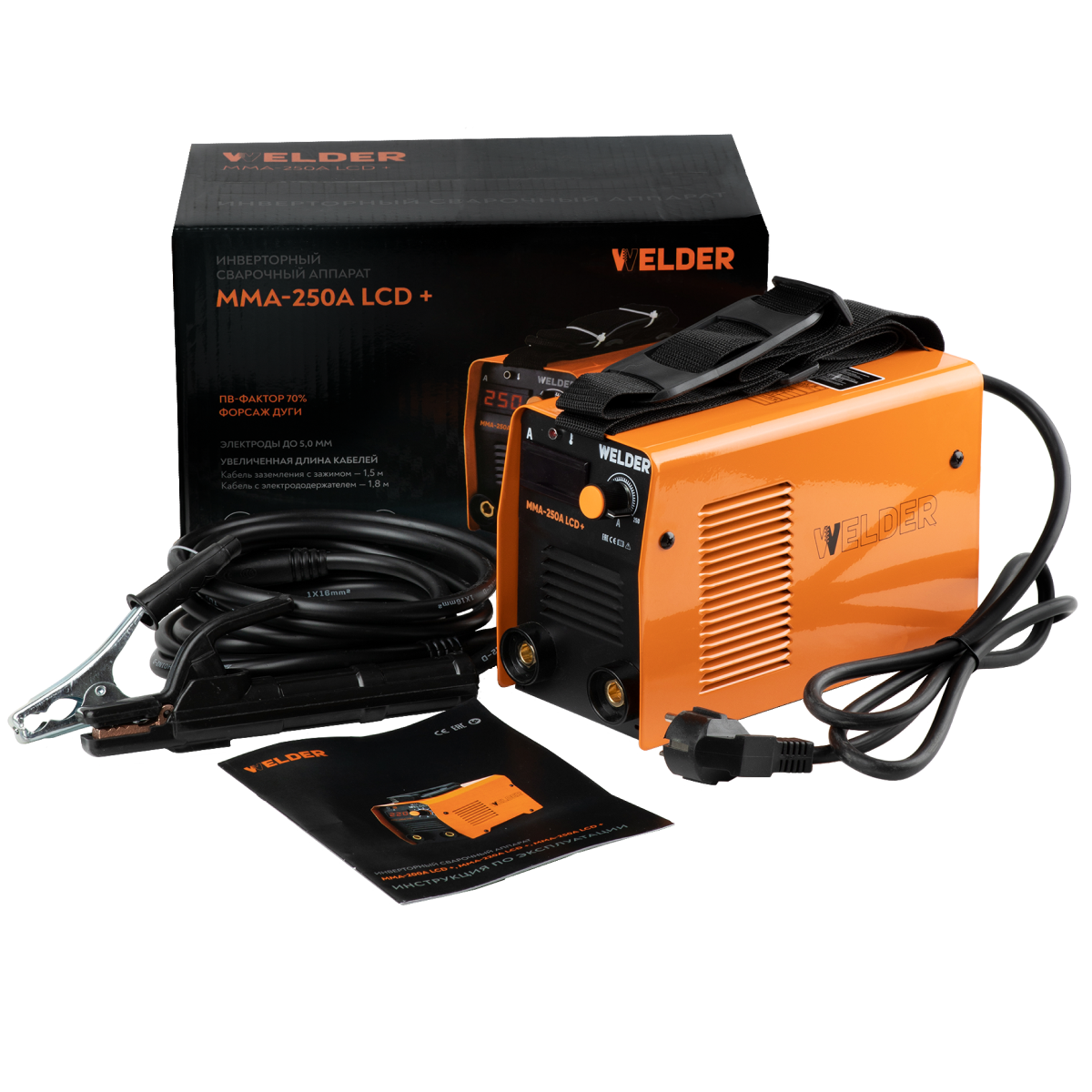 | Комплектация | Сварочный аппарат Welder MMA-220A LCD; Кабель заземления с зажимом 1,5 м; Кабель с электрододержателем 1,8 м; Плечевой ремень. |