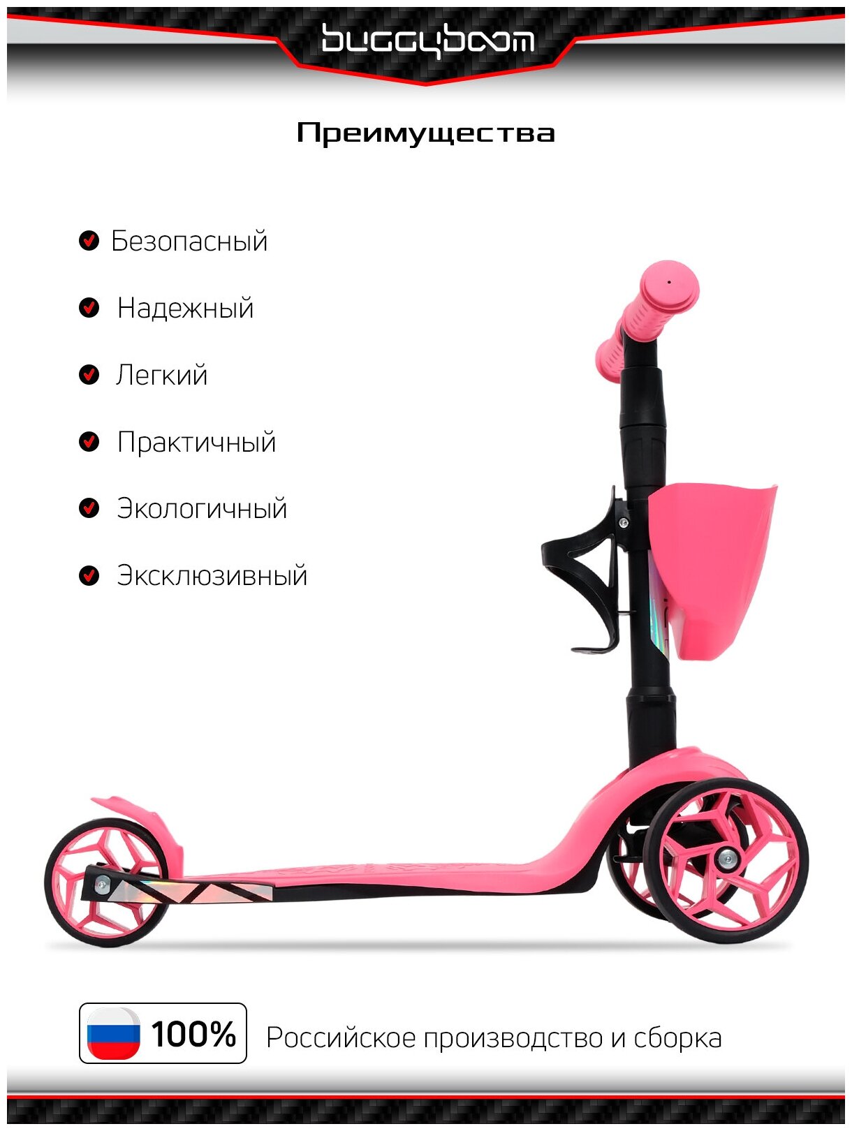 Cамокат трехколесный детский BuggyBoom Alfa Mini XR с корзинкой и подстаканником для бутылок, розовый 004-8057