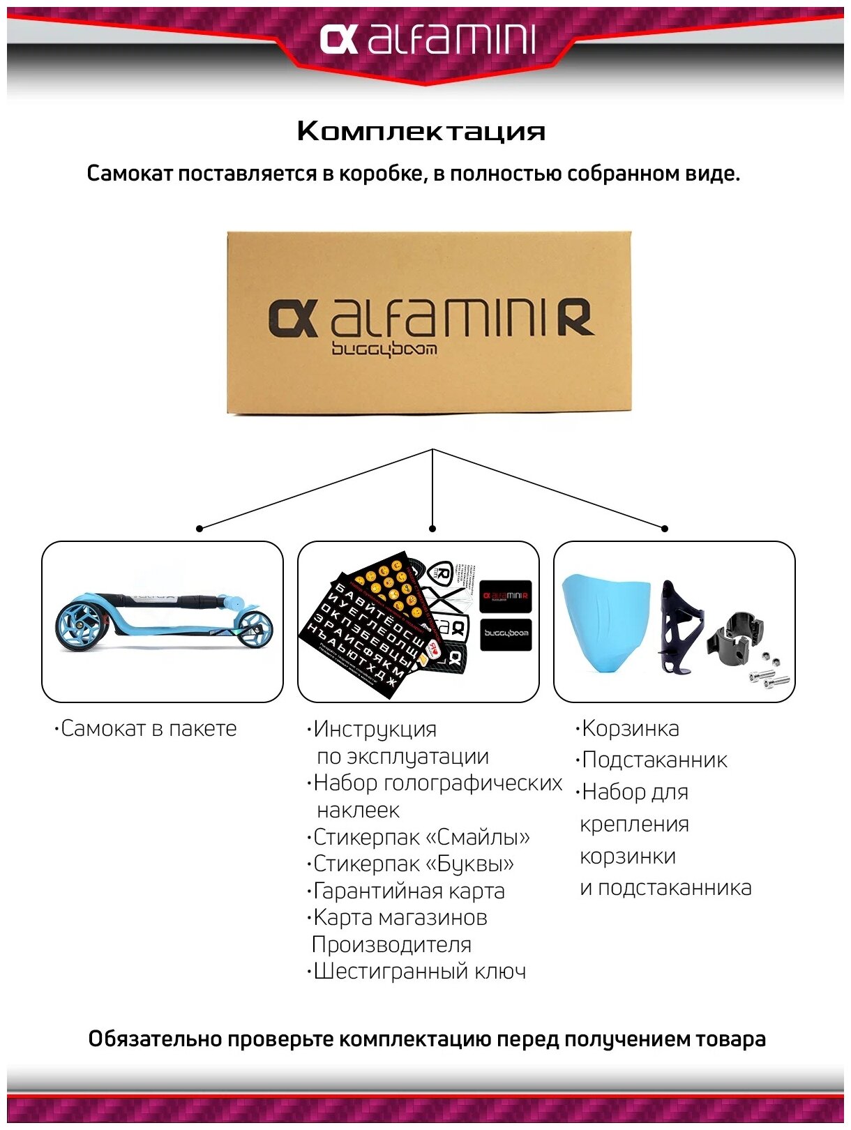 | Минусы: | Самокат приехал без корзинки и держателя для бутылки. Хотя в комплектации и на фото они есть. |