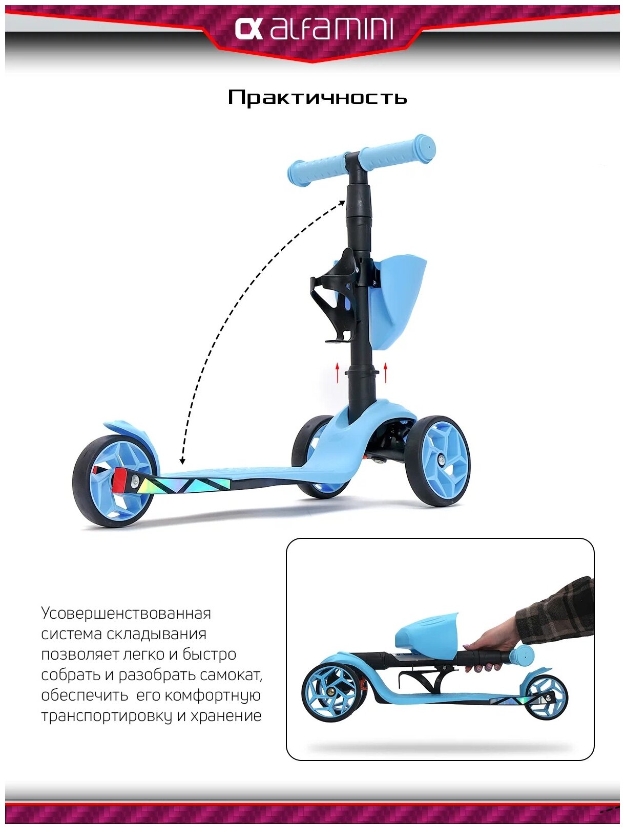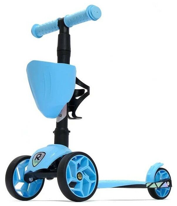 Самокат, самокат трехколесный детский, с корзинкой и подстаканником для бутылок, Alfa Mini, голубой флюр