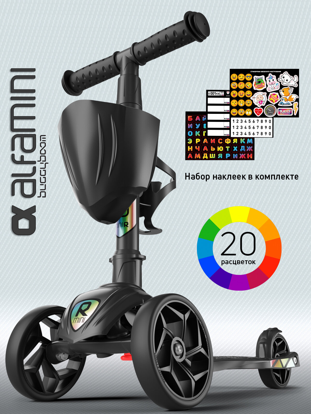 Самокат детский трехколесный с корзинкой, подстаканником для бутылок и наклейками Alfa Mini XR от Buggy Boom