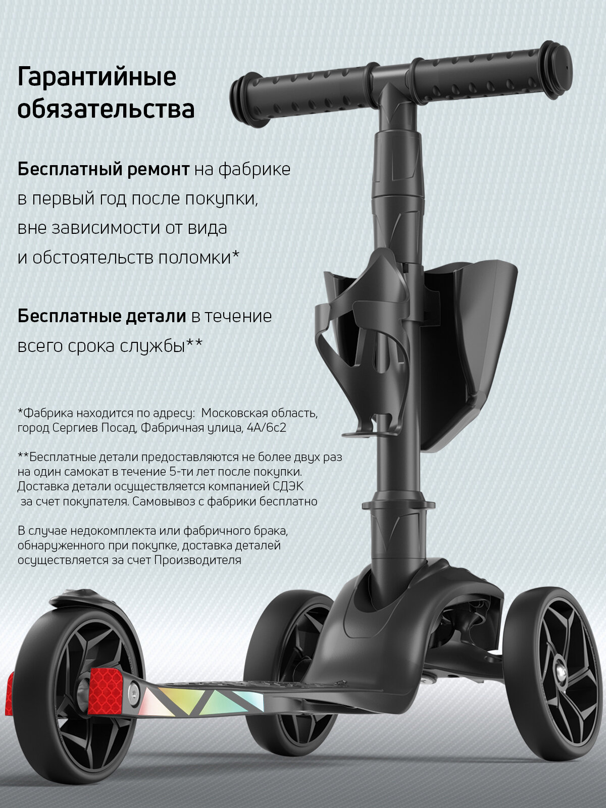 | Минусы: | Самокат приехал без корзинки и держателя для бутылки. Хотя в комплектации и на фото они есть. |