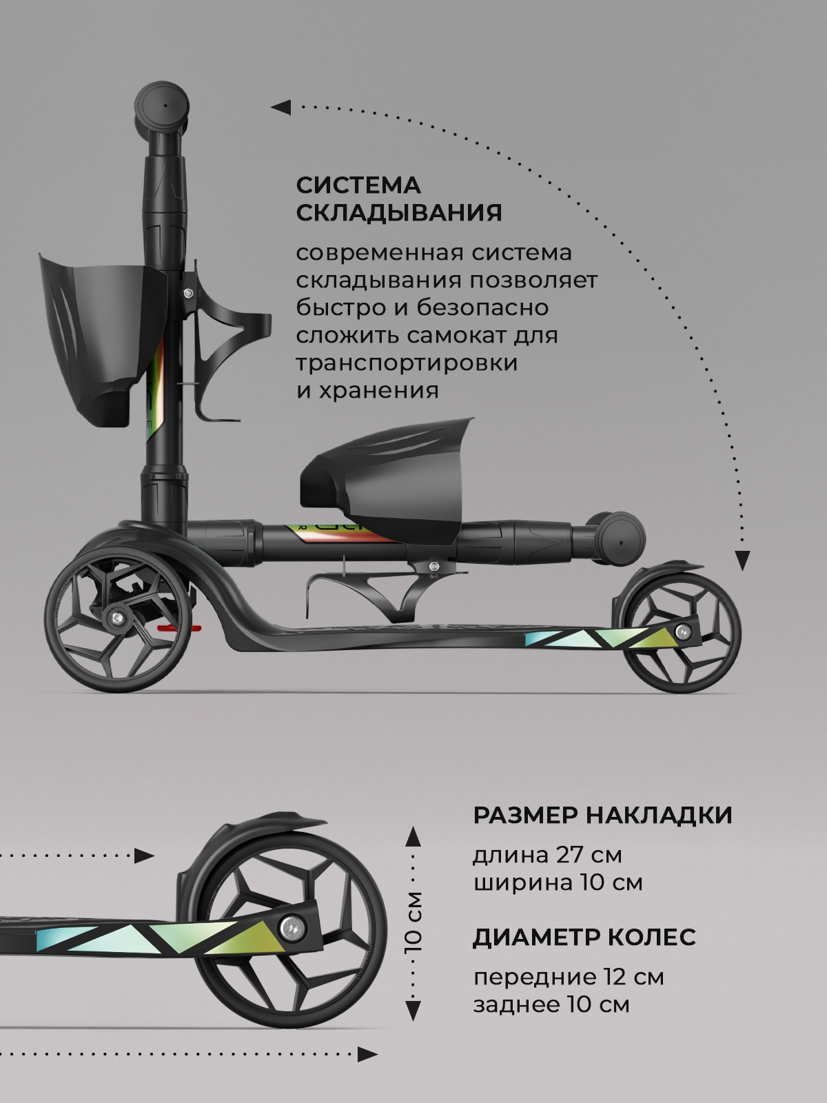 | Плюсы: | Складной механизм, наклейки в комплекте , фиксатор колёс |