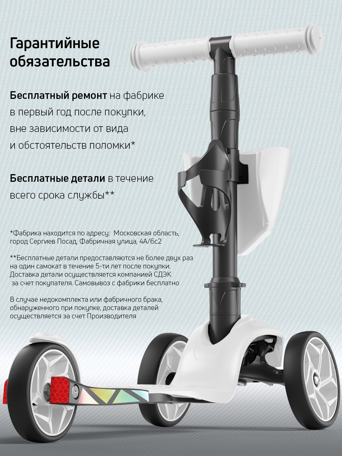 | Минусы: | Самокат приехал без корзинки и держателя для бутылки. Хотя в комплектации и на фото они есть. |