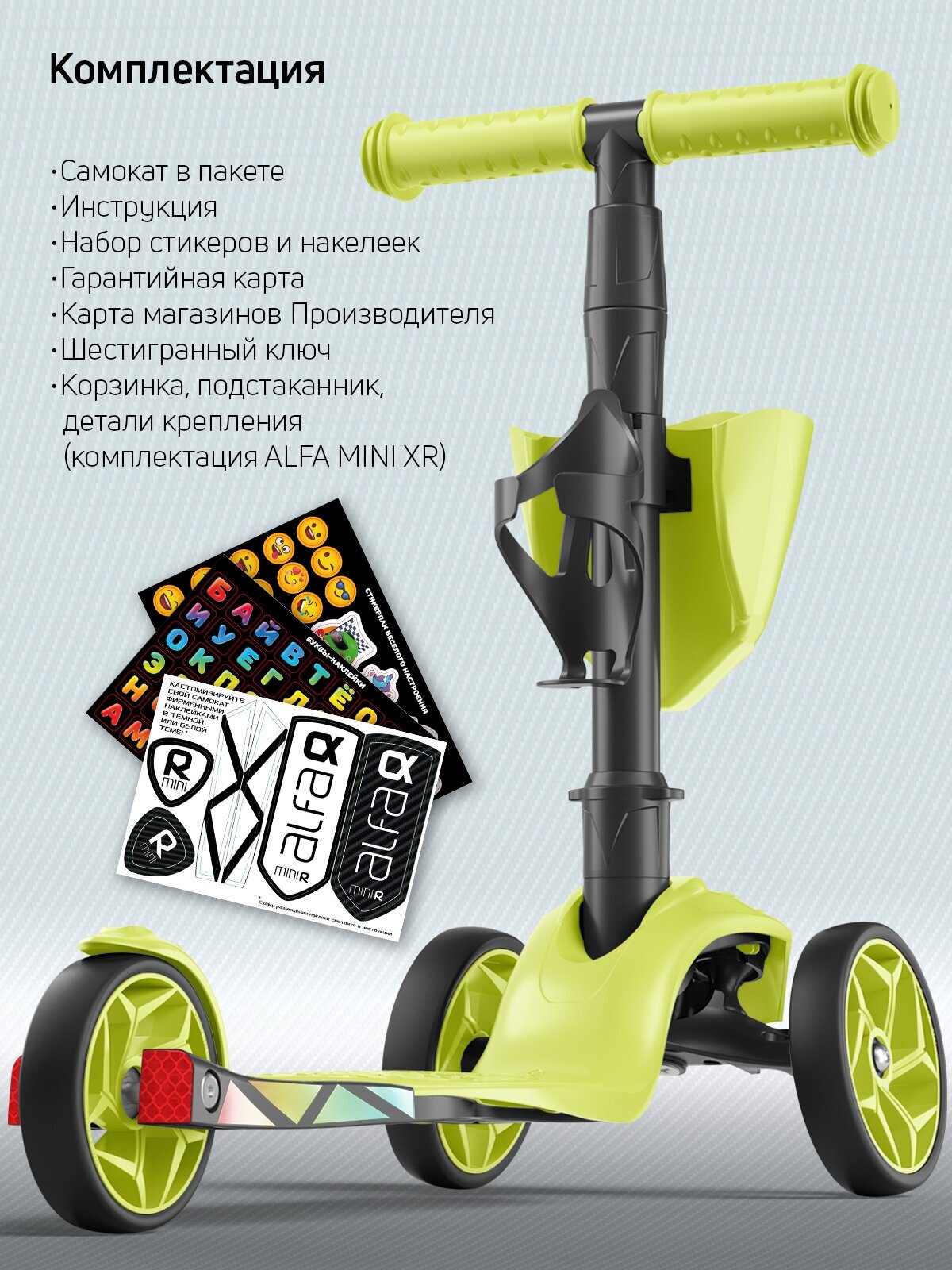 Самокат детский трехколесный с корзинкой, подстаканником для бутылок и наклейками Alfa Mini XR от Buggy Boom