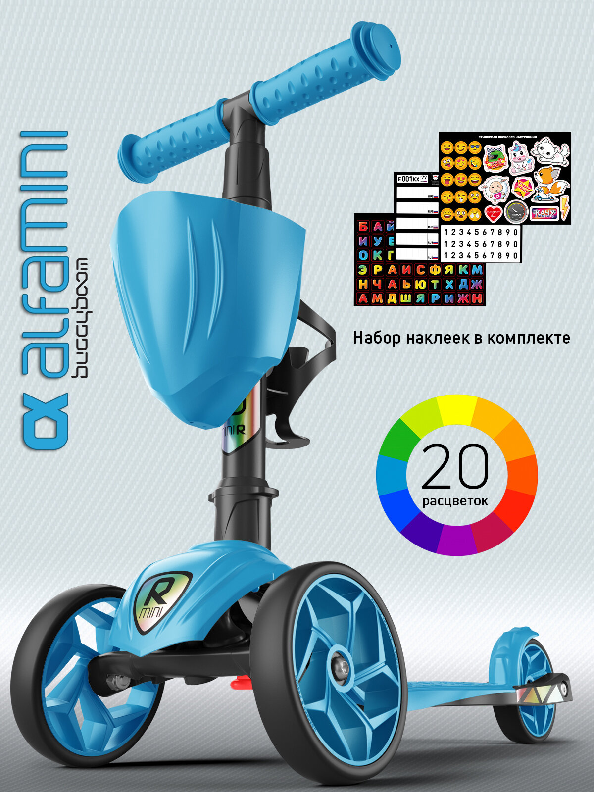 Самокат детский трехколесный с корзинкой, подстаканником для бутылок и наклейками Alfa Mini XR от Buggy Boom