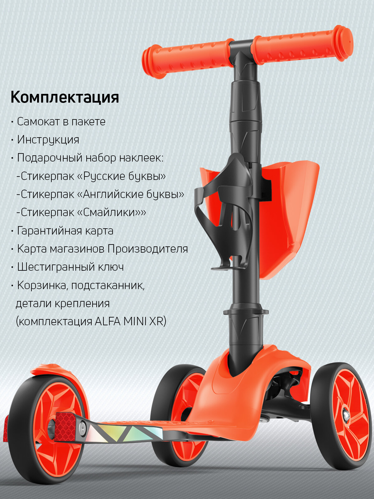Самокат детский трехколесный с корзинкой, подстаканником для бутылок и наклейками Alfa Mini XR от Buggy Boom