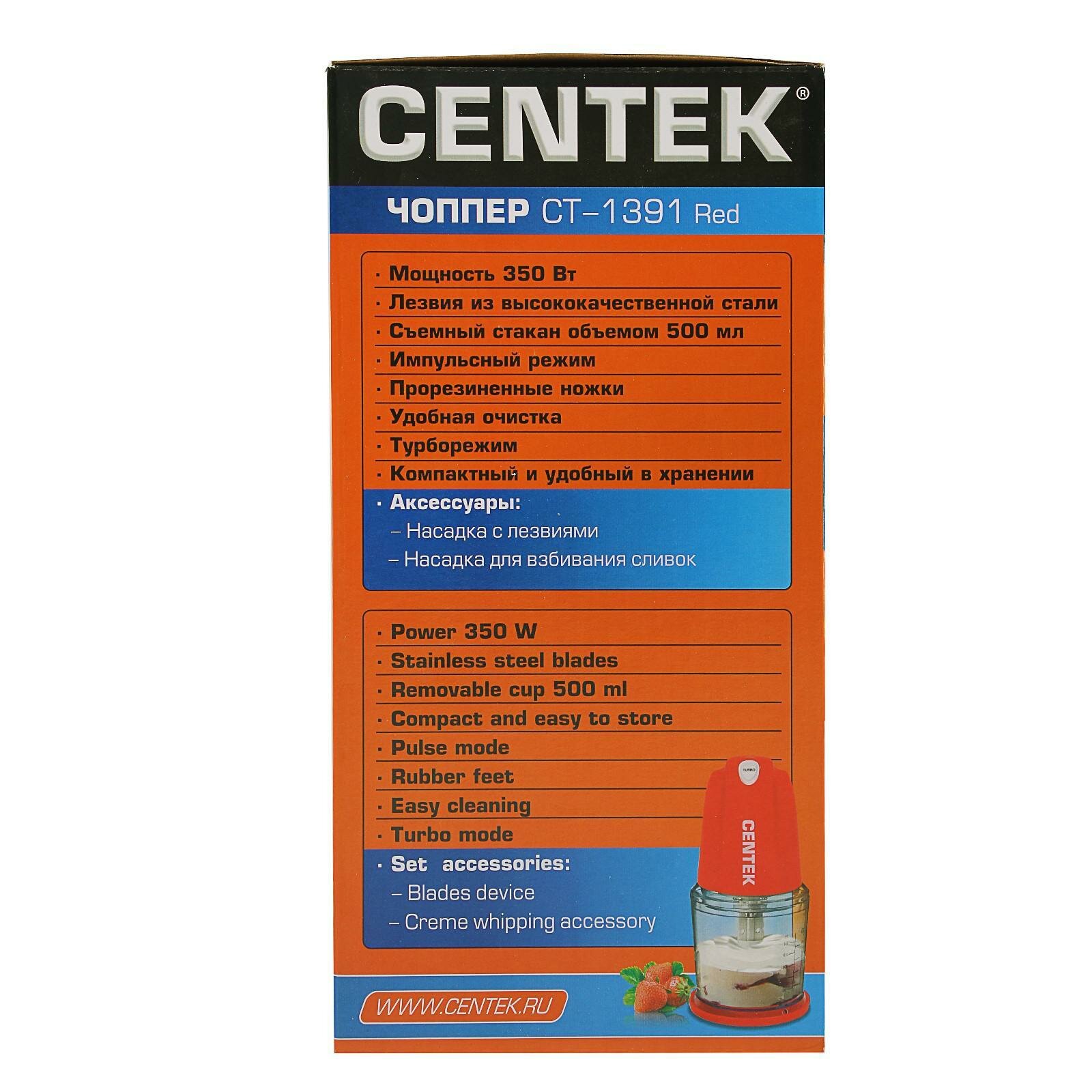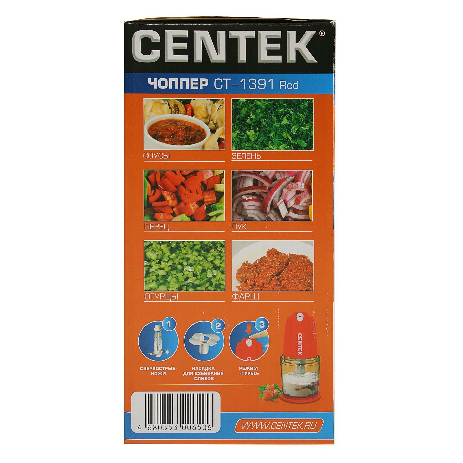 Чоппер Centek CT-1391 Red (красн) 350Вт, стакан 500 мл, насадка для сливок, турбо +импульсный режим
