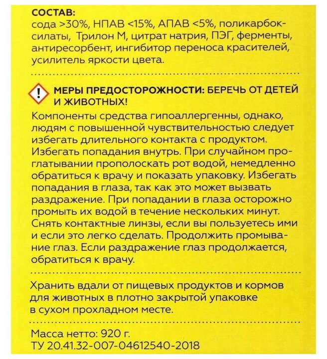 По качеству: Постирал цветные рубашки, манжеты и воротник отстирались хорошо,единственное что загрязнения не застарелые были, до этого не довожу) Детские вещи не стирали пока, дополним отзыв, если руки дойдут. Покупал по акции за 494руб., на 23 стирки. |