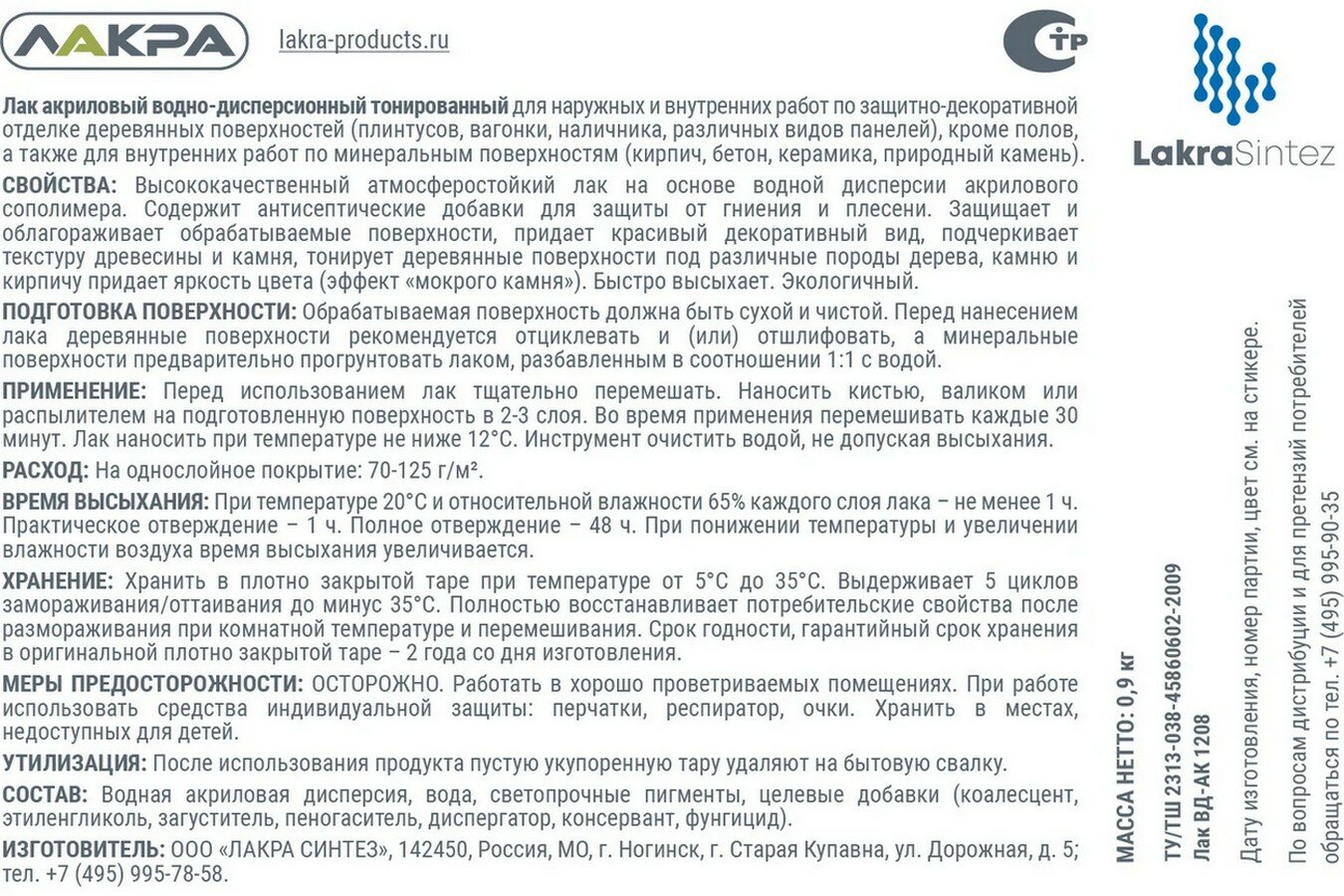 Лак Лакра Тонированный с антисептическими свойствами рябина, глянцевая, 0.9 кг, 0.9 л