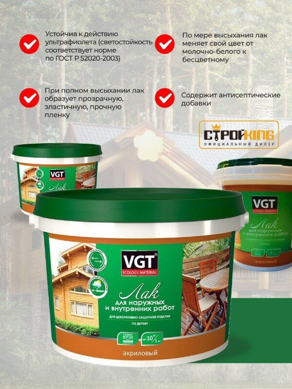 VGT ЛАК акриловый для наружных И внутренних работ по дереву, бетону, камню, матовый (2,2кг)