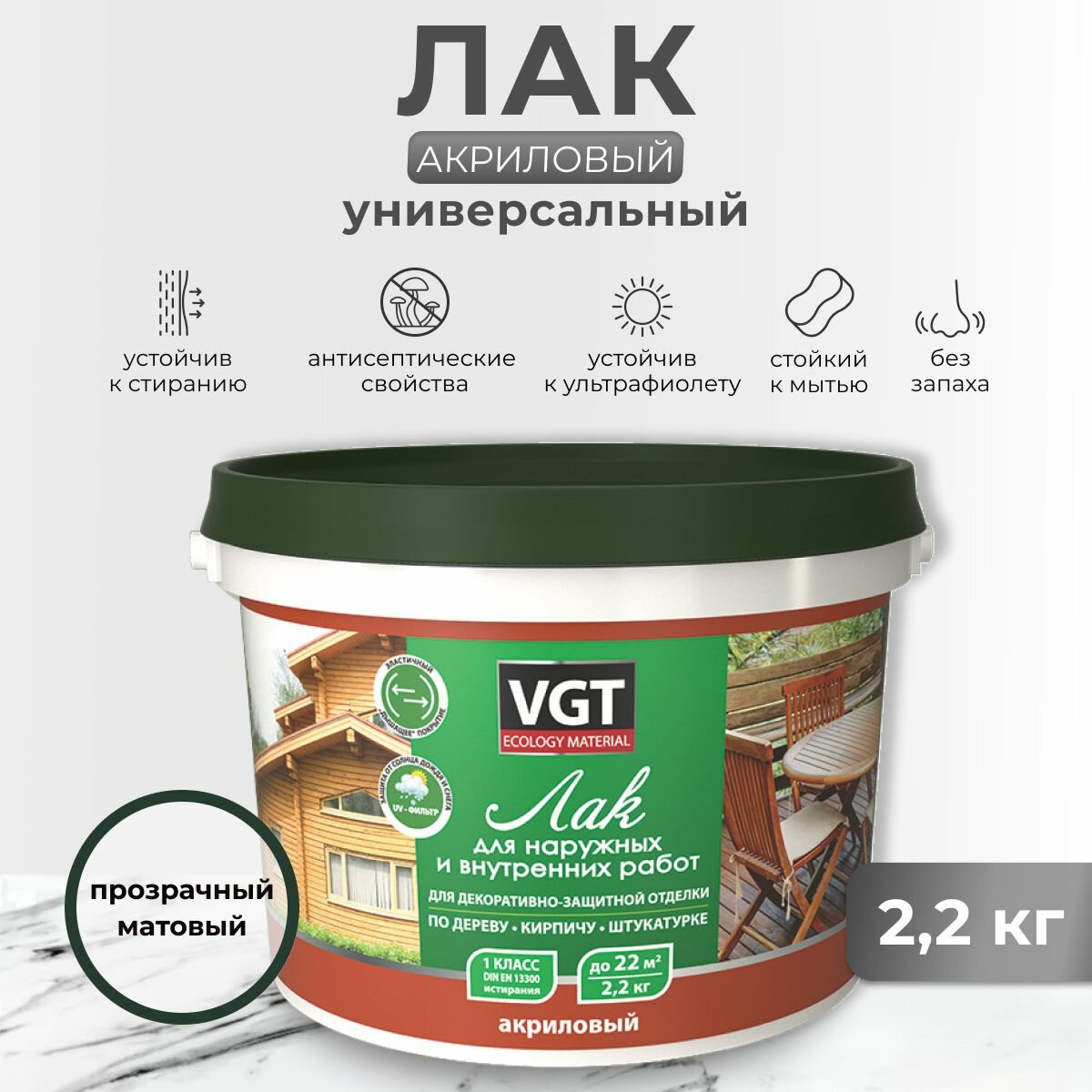 VGT ЛАК акриловый для наружных И внутренних работ по дереву, бетону, камню, матовый (2,2кг)